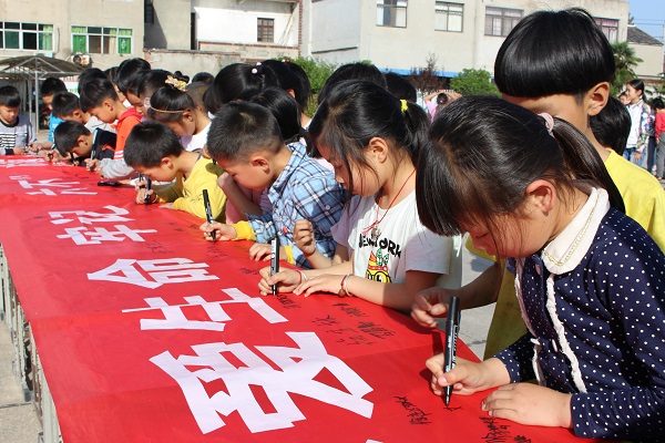 簽下安全承諾,快樂過六一。王店小學全體師生在寫有“珍愛生命,牢記六個不,預防溺水”紅色宣傳橫幅上神圣地簽下自己的名字。